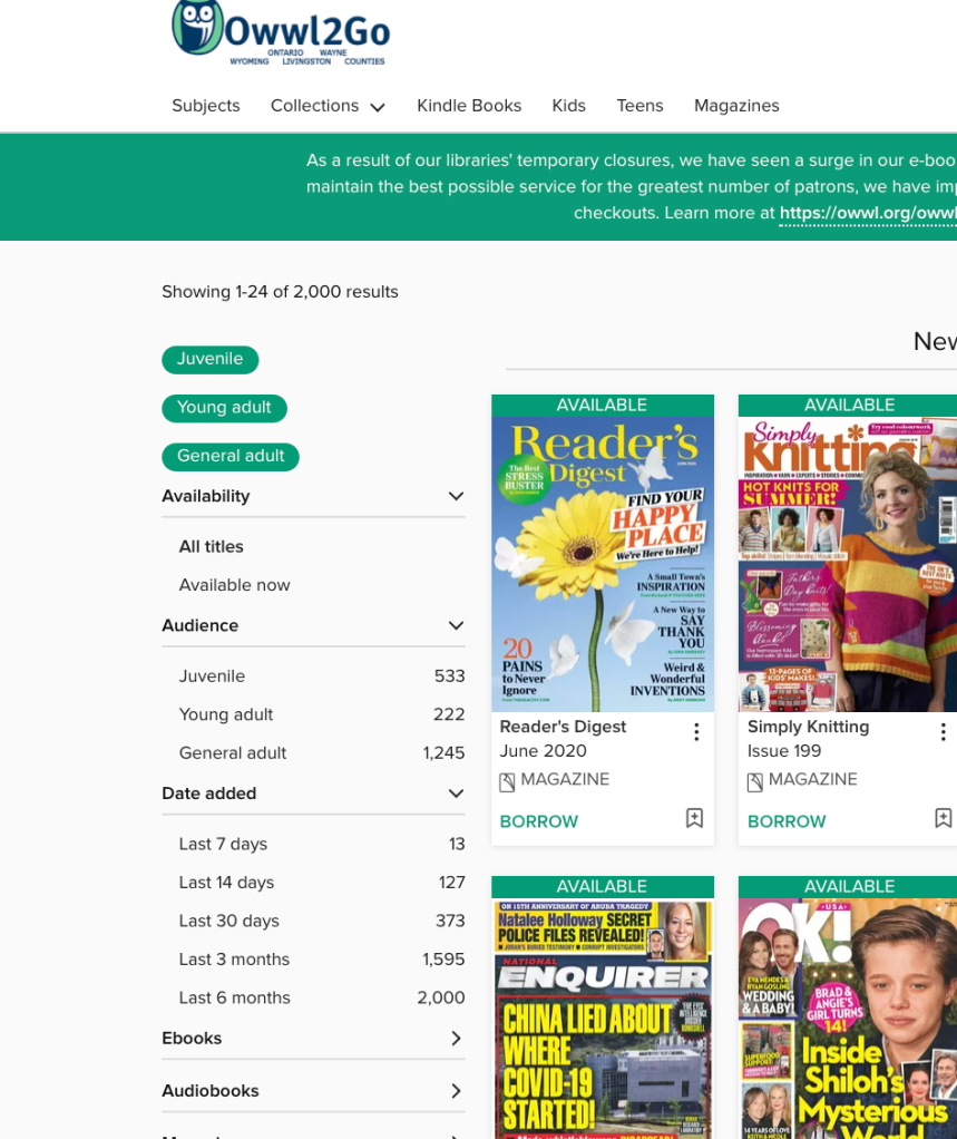 If you click on “last 7 days,” you’ll mostly get the latest issues of magazines. But when you go to “Last 14 days” or more, you’ll start to see some of the newest books that have just been added to the collection. You can also limit to just adult, young adult, or juvenile books, just audiobooks or ebooks, and more. It’s a great way to begin your search for your next book.