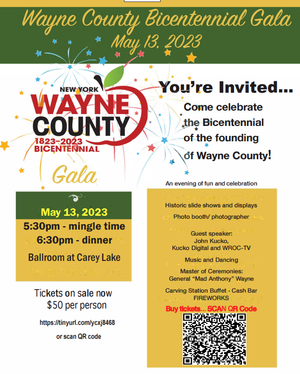 The Wayne County Bicentennial Committee is hosting a Gala at the ballroom at Carey Lake. Enjoy music and dancing, historic slide shows and displays, guest speaker John Kucko from WROC-TV, the emceeing talent of General “Mad Anthony” Wayne and dine from buffet complete with a carving station. There will be a cash bar and photographing available.