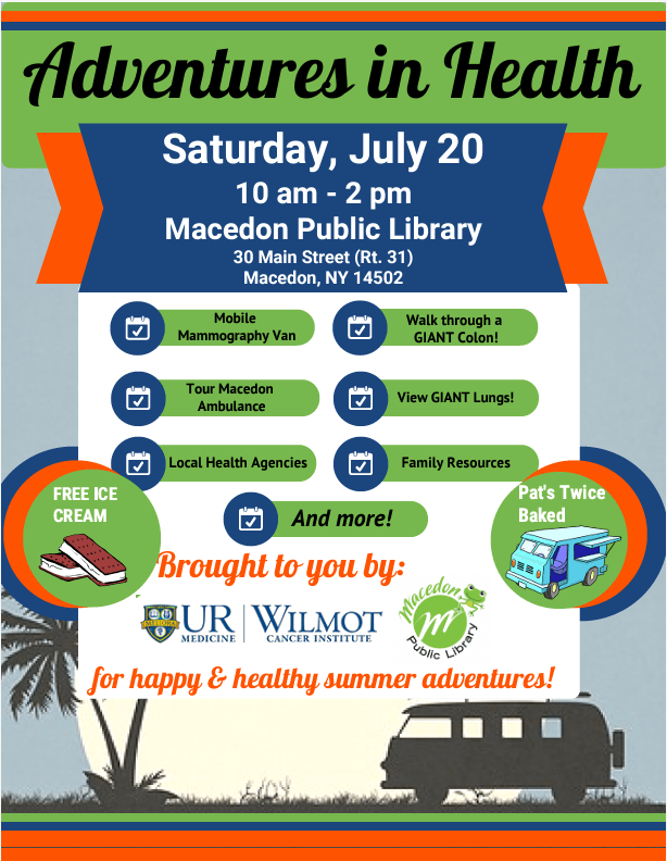Stop by the Macedon Public Library tomorrow, July 20, from 10 am-2 pm to check out our health fair. You can tour a Macedon ambulance, walk through a giant colon, and sample the great food of Pat’s Twice Baked food truck. And there’s much more!