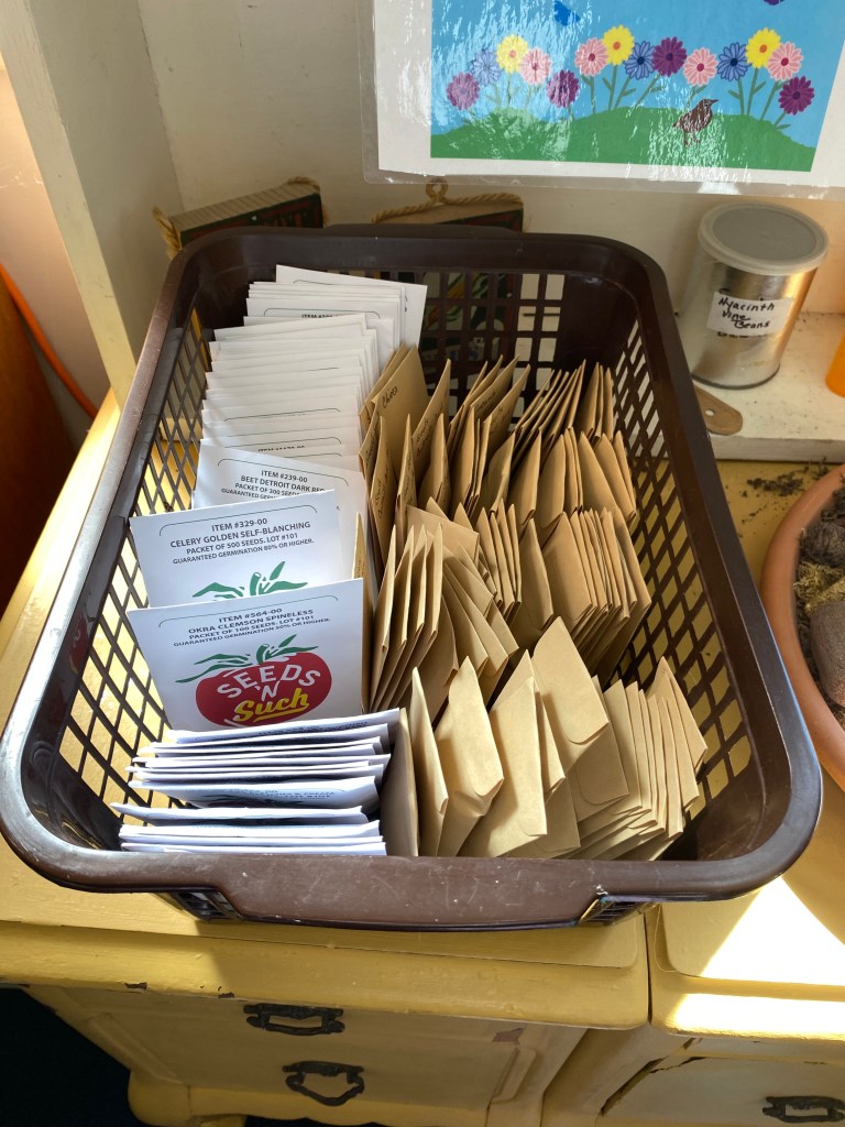 What’s a seed library? Simply put, it’s like a regular library in that you check out items, at no cost, for your use. But instead of books, the seed library has—seeds. Seeds for flowers, seeds for vegetables, and seeds for herbs. You are welcome to take a few envelopes of seeds (please limit it to three or four per visit, so there’s enough for everyone) that you can plant them in you garden and reap the tasty—or pretty—harvest.
