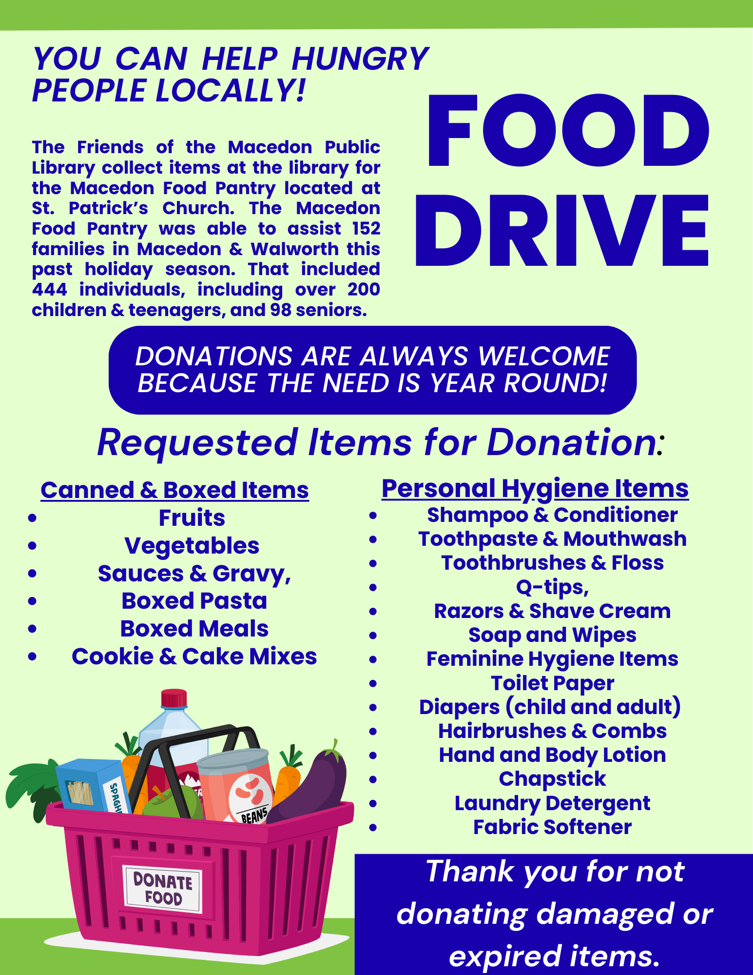 Next time you’re heading into MPL to pick up a few books, why not bring a can or two of food to help those who are hungry in our community. The list below suggests some of the items that are most needed. Thanks in advance for your assistance!